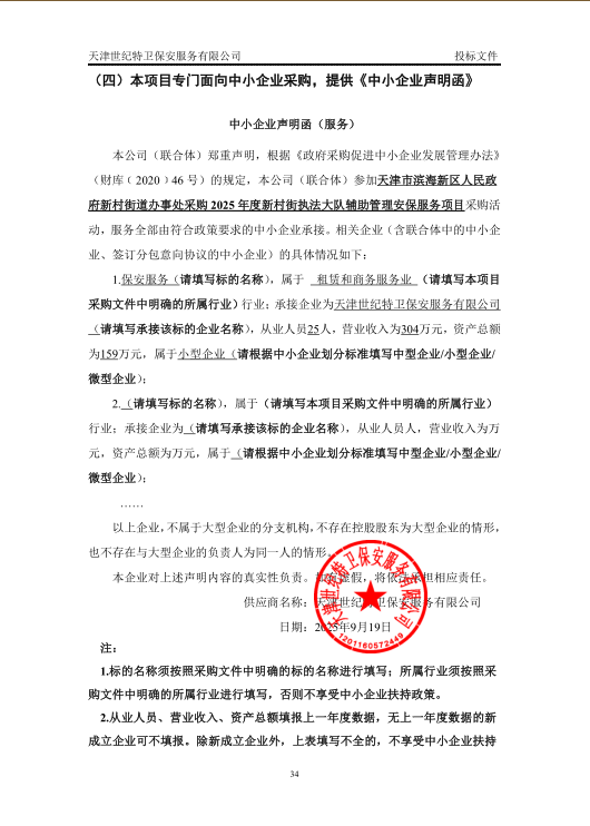 受天津市滨海新区人民政府新村街道办事处委托,天津市滨海新区政府采购中心以竞争性磋商方式,对天津市滨海新区人民政府新村街道办事处采购****年度新村街执法大队辅助管理安保服务项目实施采购,现将成交结果公布如下: 一、项目名称和编号 *.项目名称:天津市滨海新区人民政府新村街道办事处采购****年度新村街执法大队辅助管理安保服务项目 *.项目编号:**************** 二、成交信息 *.成交供应商名称:天津世纪特卫保安服务有限公司 *.成交供应商地址:天津市滨海新区大港东华路***号 *.供应商评审报价、评审总得分及排序情况:见附件 *.主要成交标标的名称、规格型号、数量、单价、服务要求或者标的基本概况:保安服务 三、磋商小组成员名单 李安娜、仲静、刘虎(采购人代表) 四、项目联系人及联系方式 *.联系人:肖琳 *.联系电话:************ 五、采购人的名称、地址和联系方式 *.采购人名称:天津市滨海新区人民政府新村街道办事处 *.采购人地址:天津市滨海新区塘沽西半圆路**号新村街道办事处 *.采购人联系电话:刘广帅,************ 六、采购代理机构的名称、地址和联系方式 *.采购代理机构名称:天津市滨海新区政府采购中心 *.采购代理机构地址:天津市滨海新区营口道***号 *.采购代理机构联系方式:************ 七、质疑方式 参与本项目政府采购活动的供应商认为成交结果使自己的合法权益受到损害的,可以在成交结果公告期限届满之日起*个工作日内,以书面形式向采购人和天津市滨海新区政府采购中心提出质疑,逾期不予受理。 八、本项目不向成交供应商收取服务费。 九、成交结果公告期限 成交结果的公告期限为*个工作日。 十、竞争性磋商文件公告:见附件