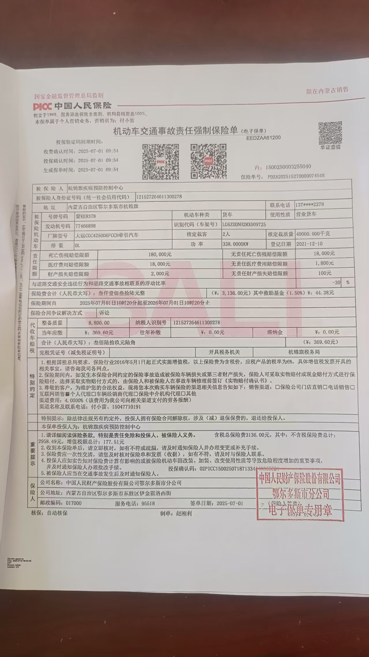 一、合同编号:********************二、合同名称:车辆保险合同三、项目编号:鄂财购备字(电子)[****]*******号四、项目名称:车辆保险五、合同主体采购人(甲方):杭锦旗疾病预防控制中心 地址:杭锦旗锡尼镇杭锦大街与胜利路交汇处 联系方式:*********** 供应商(乙方):中国人民财产保险股份有限公司鄂尔多斯市分公司 地址:内蒙古自治区鄂尔多斯市东胜区伊金霍洛西街 联系方式:*********** 六、合同主要信息主要标的: