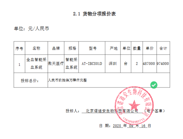 | *、采购内容:全血智能采血系统的供货、运输、保险、装卸、验收交付、培训、技术支持、质保及相关伴随服务等。 *、采购产品名称和数量:全血智能采血系统,*台 *、质量要求:合格,满足国家相关标准及采购人要求。 *、交货地点:采购人指定地点 *、验收标准:按照招标文件的技术要求以及国家或行业现行标准执行。 *、供货期:接到甲方通知后**天内,送货至河南省红十字血液中心。 *、质保期:整机免费质保服务≥*年(从设备验收合格之日起) *、合同履行期限:合同签订之日至质保期结束 | |||||||||||||||||||||||||||||||