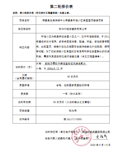 博爱县住房保障中心博爱县和谐小区房屋屋顶维修项目(二次)*成交公告