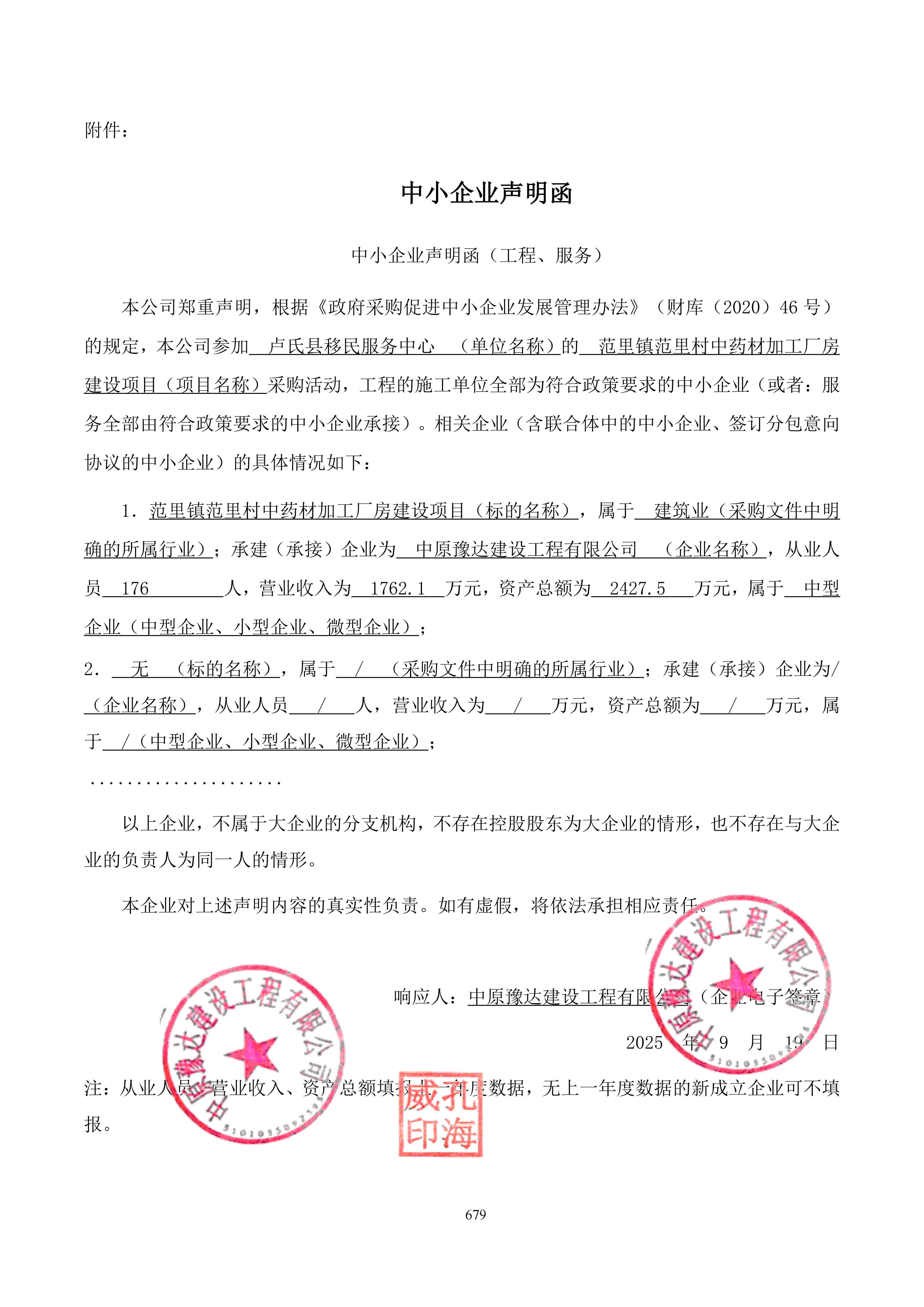 卢氏县移民服务中心范里镇范里村中药材加工厂房建设项目*成交公告