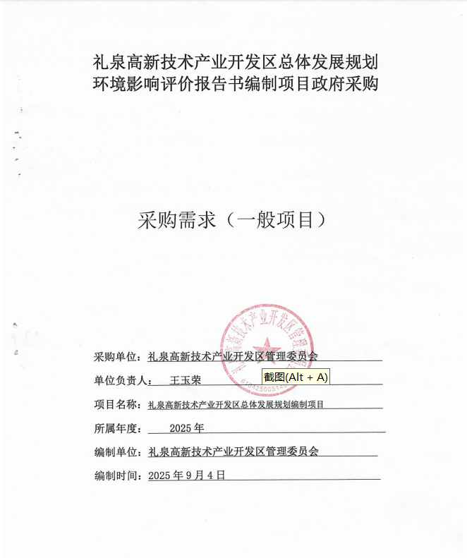 项目名称:礼泉高新技术产业开发区总体发展规划环境影响报告书编制服务项目