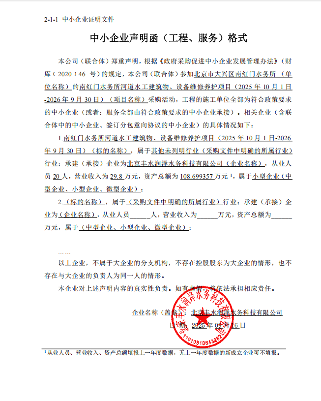 | 北京丰水润泽水务科技有限公司 | * | ***.*****万元 | ***.*****万元 | 对**座水闸、**.****万平方米巡河路、**.******万平方米护坡(浆砌石、混凝土、鱼巢砖)进行巡视检查,闸(坝)护坡护底维修养护、混凝土破损修补、裂缝处理、附属设施维护;巡河路破损修补等。合同履行期限:一年(****年**月*日*****年*月**日)。 |