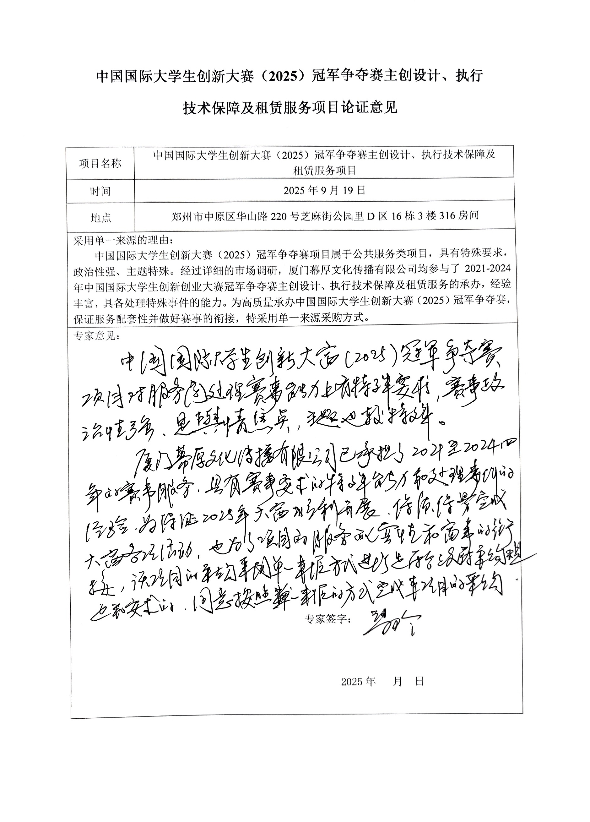| 中国国际大学生创新大赛(****)冠军争夺赛项目属于公共服务类项目,具有特殊要求,政治性强、主题特殊。经过详细的市场调研,厦门幕厚文化传播有限公司参与了*********年中国国际大学生创新创业大赛冠军争夺赛主创设计、执行技术保障及租赁服务的承办,经验丰富,具备处理特殊事件的能力。为高质量承办中国国际大学生创新大赛(****)冠军争夺赛,保证服务配套性并做好赛事的衔接,特采用单一来源采购方式。 | ||||||||||||||||