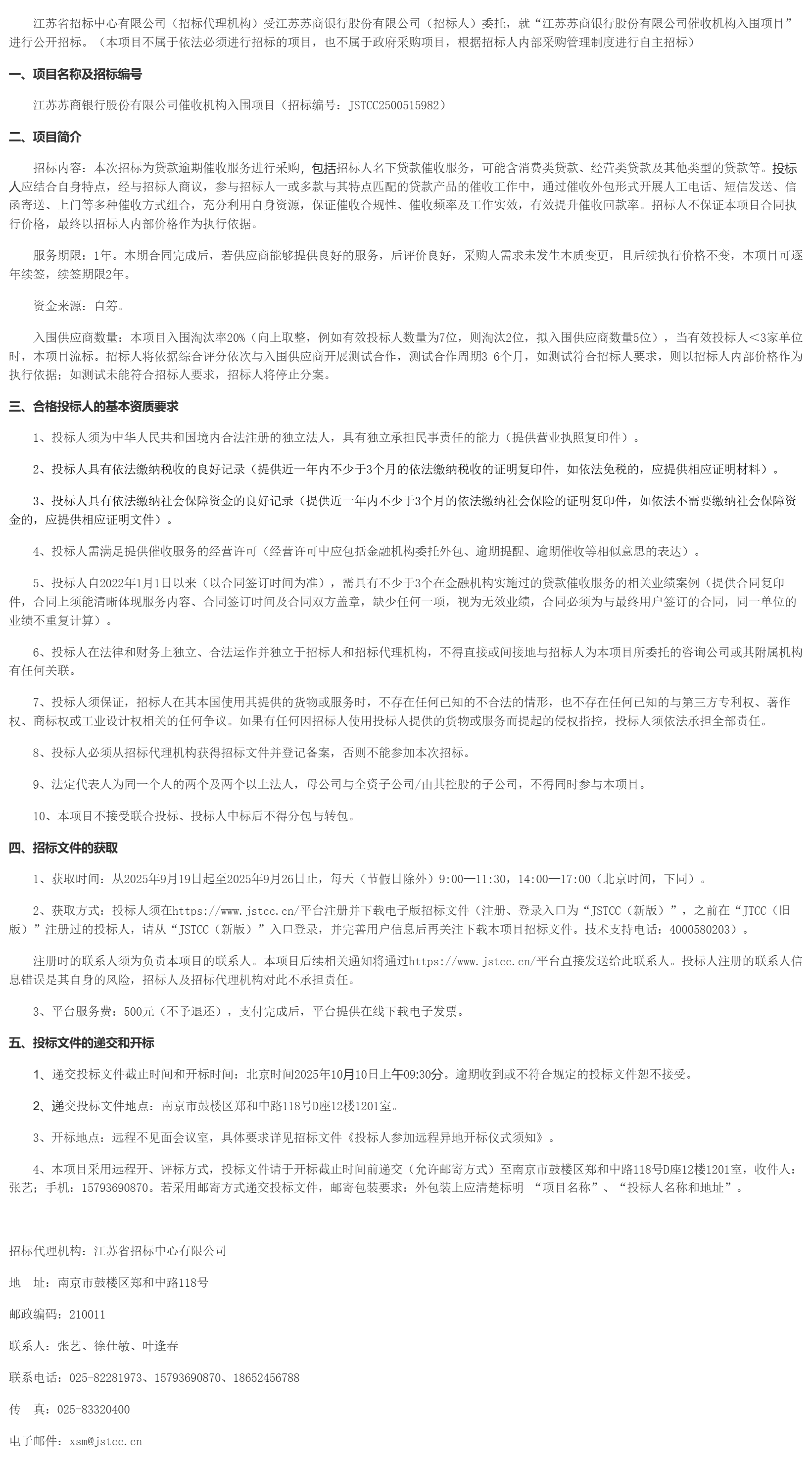 江苏省招标中心有限公司(招标代理机构)受江苏苏商银行股份有限公司(招标人)委托,就“江苏苏商银行股份有限公司催收机构入围项目”进行公开招标。(本项目不属于依法必须进行招标的项目,也不属于政府采购项目,根据招标人内部采购管理制度进行自主招标)