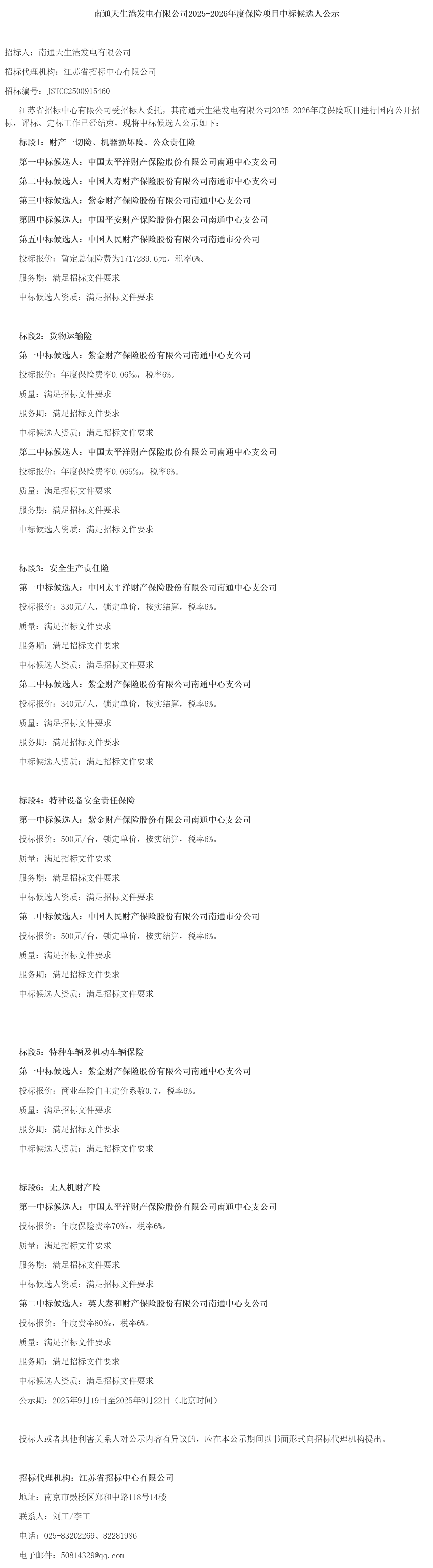 江苏省招标中心有限公司受招标人委托,其南通天生港发电有限公司*********年度保险项目进行国内公开招标,评标、定标工作已经结束,现将中标候选人公示如下: