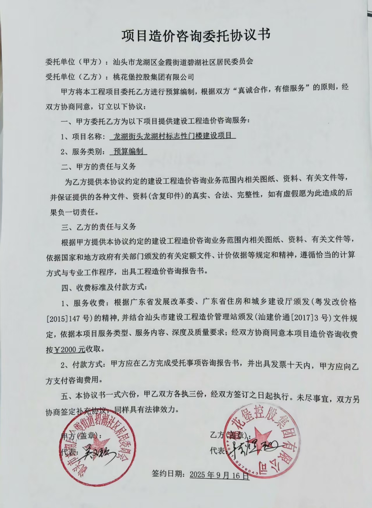 汕头市龙湖区金霞街道碧湖社区居民委员会采购龙湖街头龙湖村标志性门楼建设项目预算编制服务合同公开