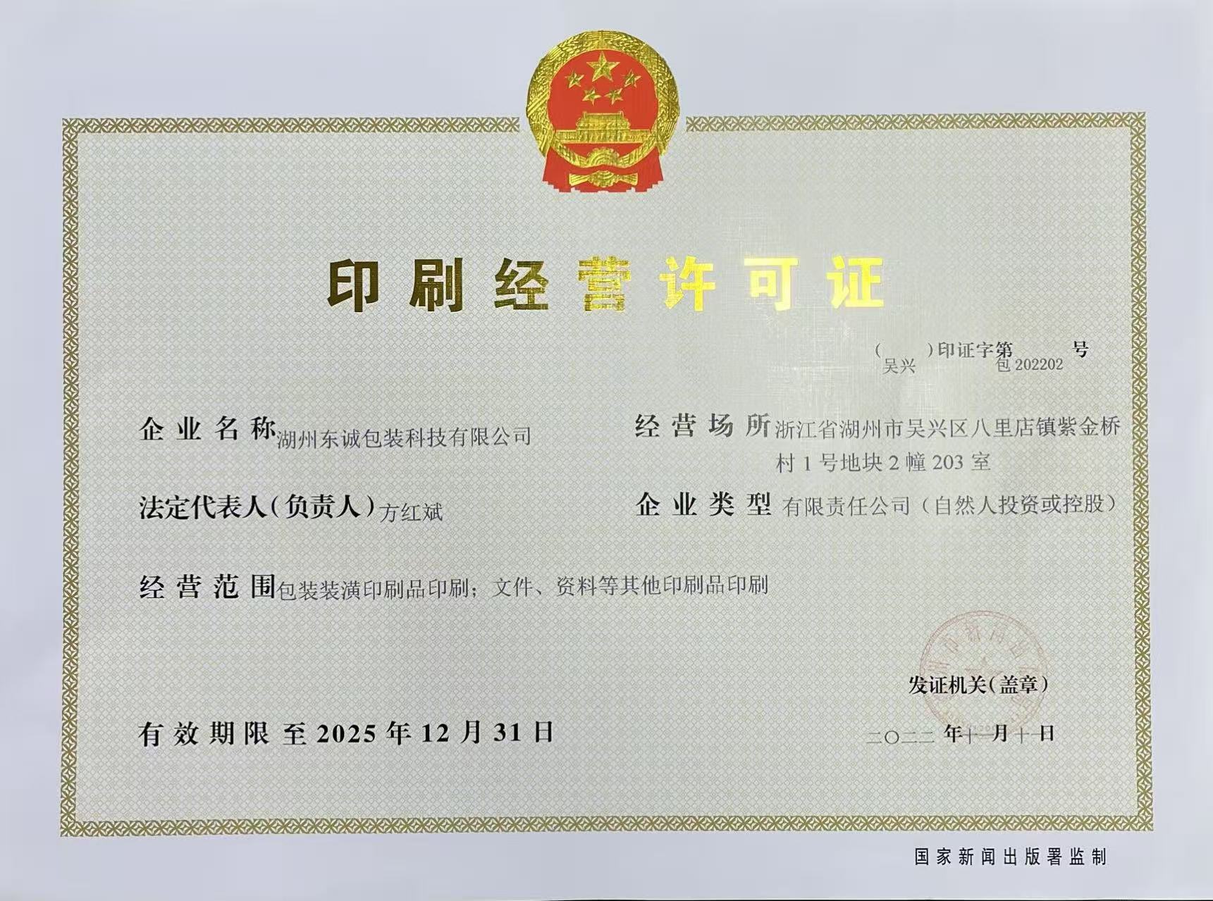 湖州东诚包装科技有限公司具有包装装潢印刷资质的印刷企业(包装装潢印刷品,包括商标标识、广告宣传品及作为产品包装装潢的纸、金属、塑料等的印刷品)。