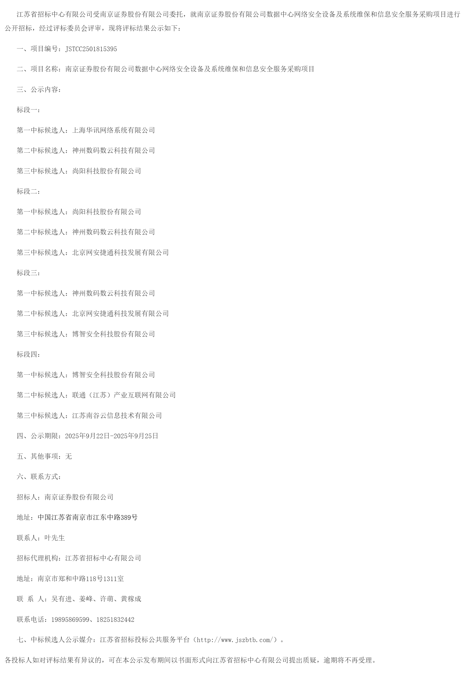 江苏省招标中心有限公司受南京证券股份有限公司委托,就南京证券股份有限公司数据中心网络安全设备及系统维保和信息安全服务采购项目进行公开招标,经过评标委员会评审,现将评标结果公示如下: