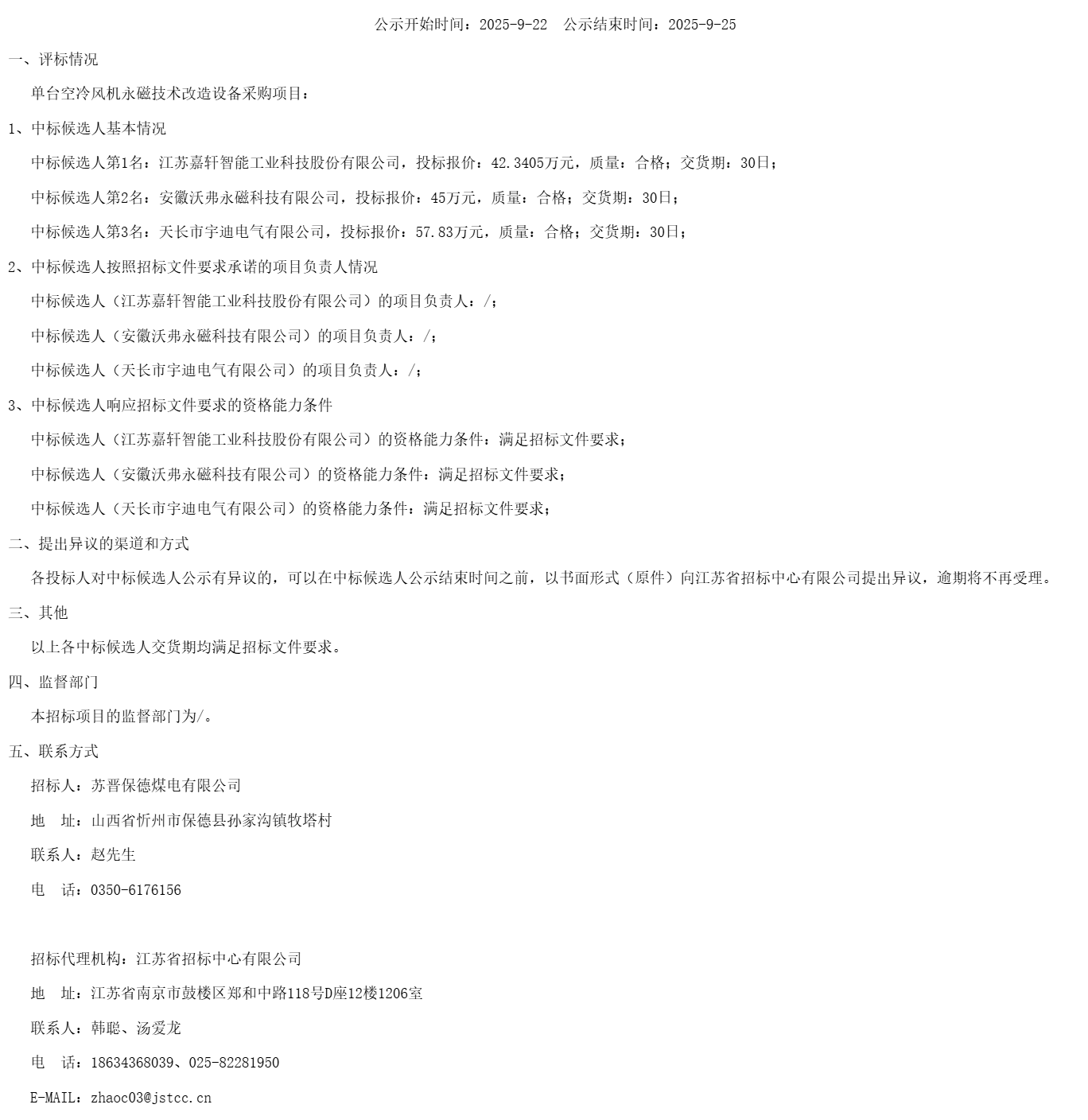 苏晋保德煤电有限公司单台空冷风机永磁技术改造设备采购项目(重新招标)中标候选人公示(***************)