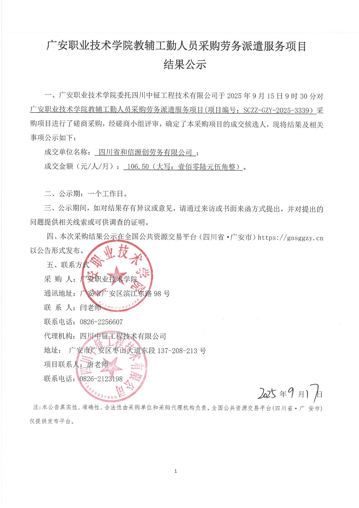 广安职业技术学院教辅工勤人员采购劳务派遣服务项目结果公示