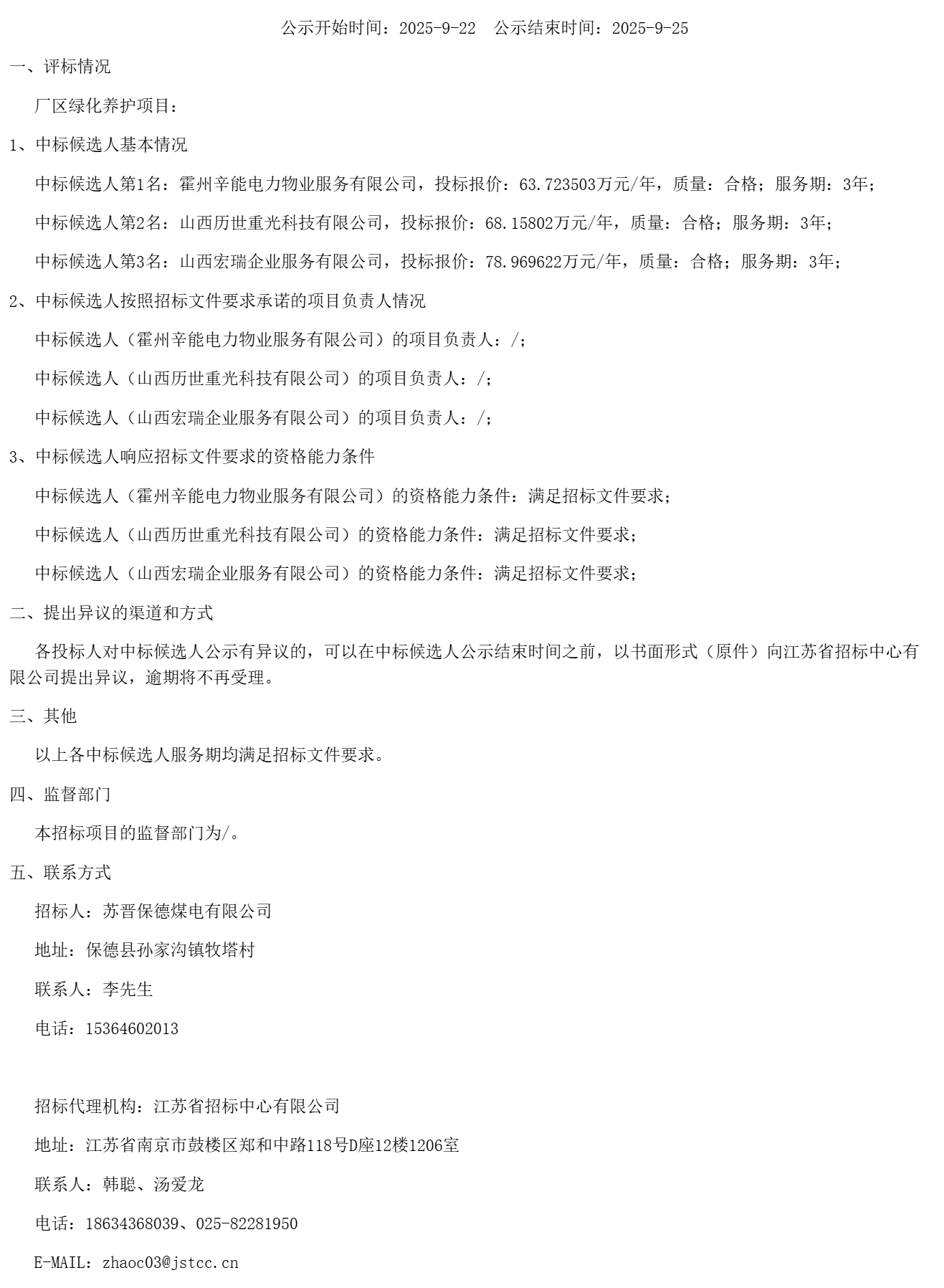 苏晋保德煤电有限公司厂区绿化养护项目(重新招标)中标候选人公示(***************)