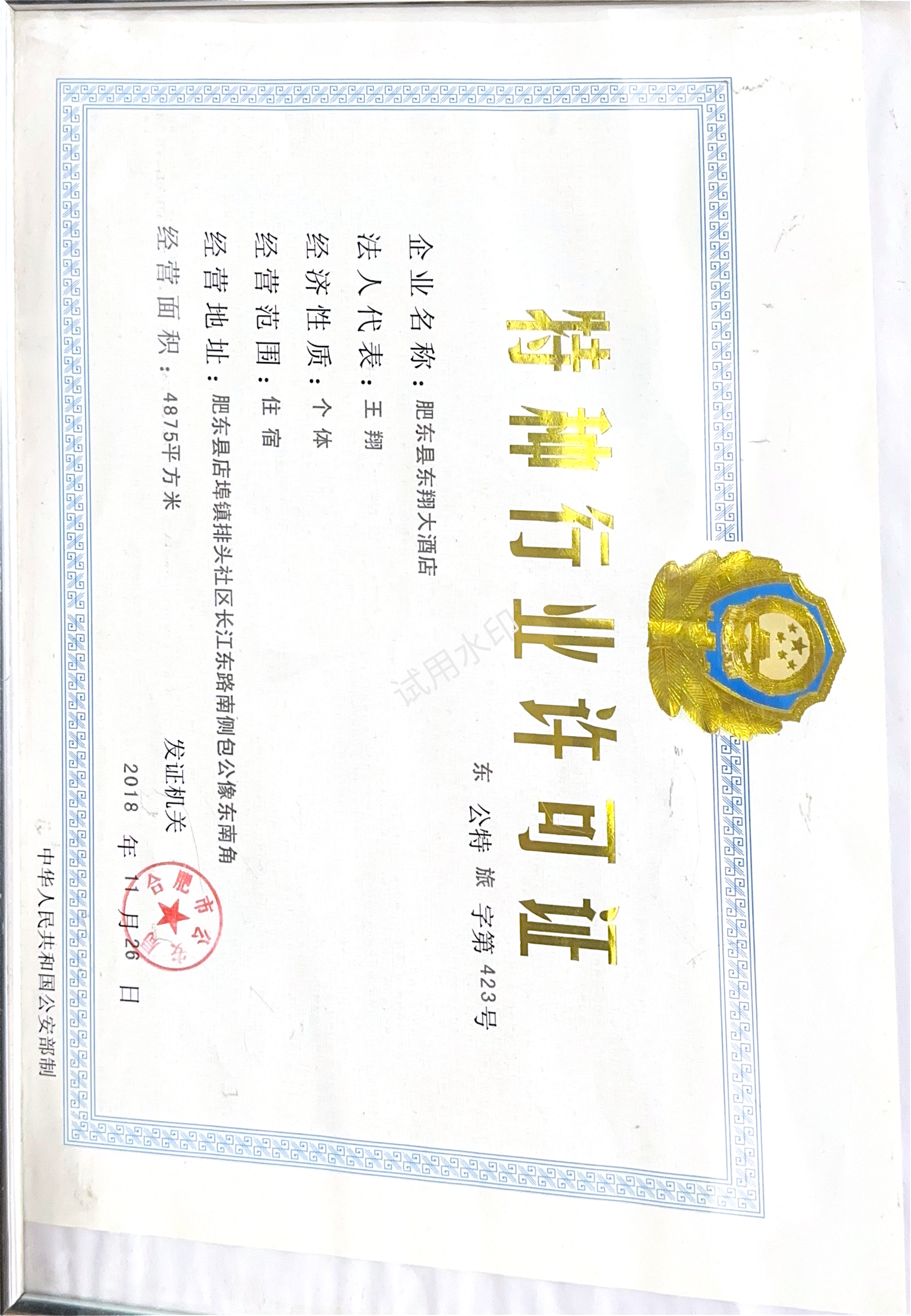 有效期内的《特种行业许可证》:特种行业许可证**.***