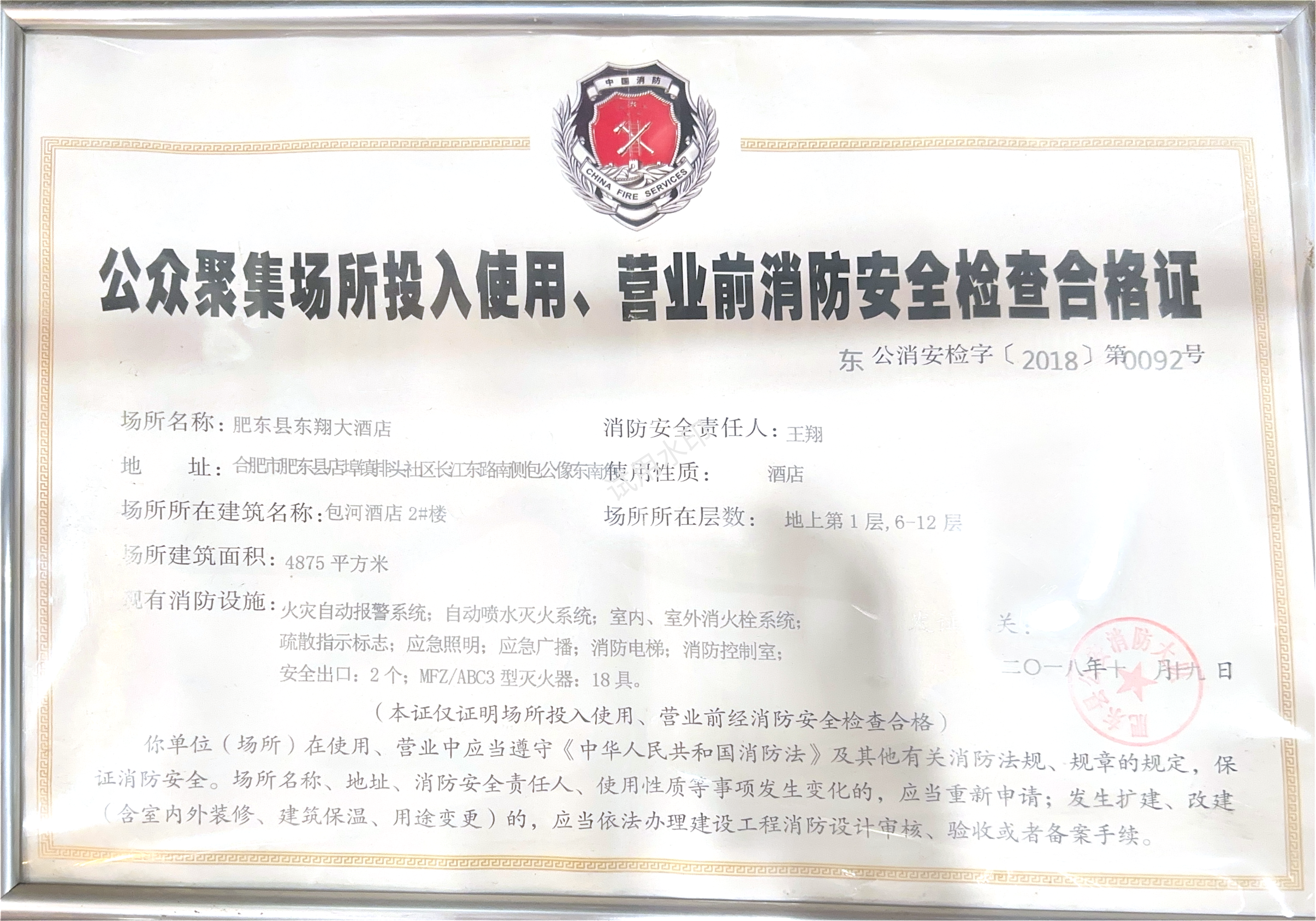 有效期内的消防安全检查合格证明:公众聚集场所投入使用、营业前消防安全检查合格证***.***