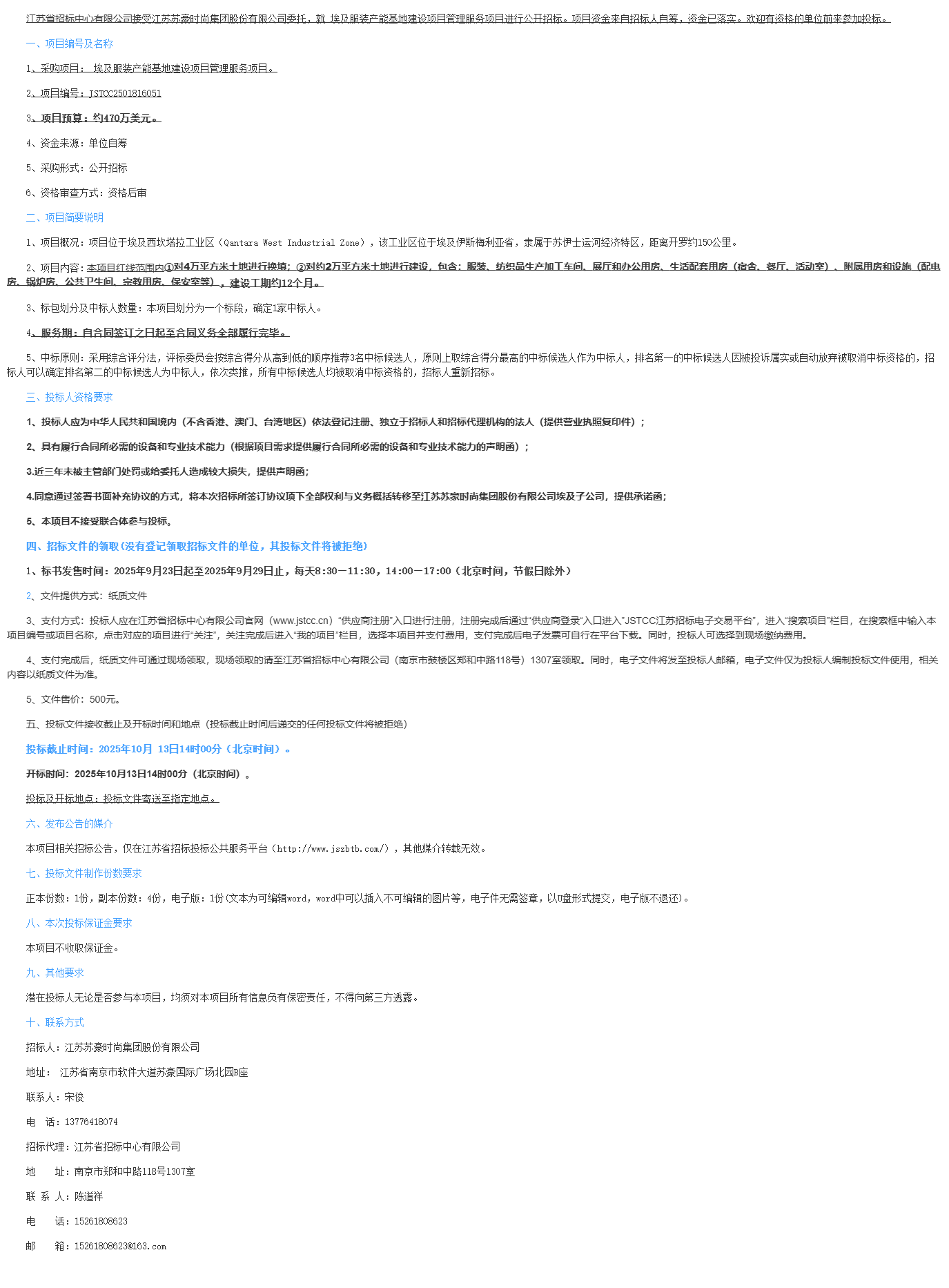 江苏省招标中心有限公司接受江苏苏豪时尚集团股份有限公司委托,就 埃及服装产能基地建设项目管理服务项目进行公开招标。项目资金来自招标人自筹,资金已落实。欢迎有资格的单位前来参加投标。