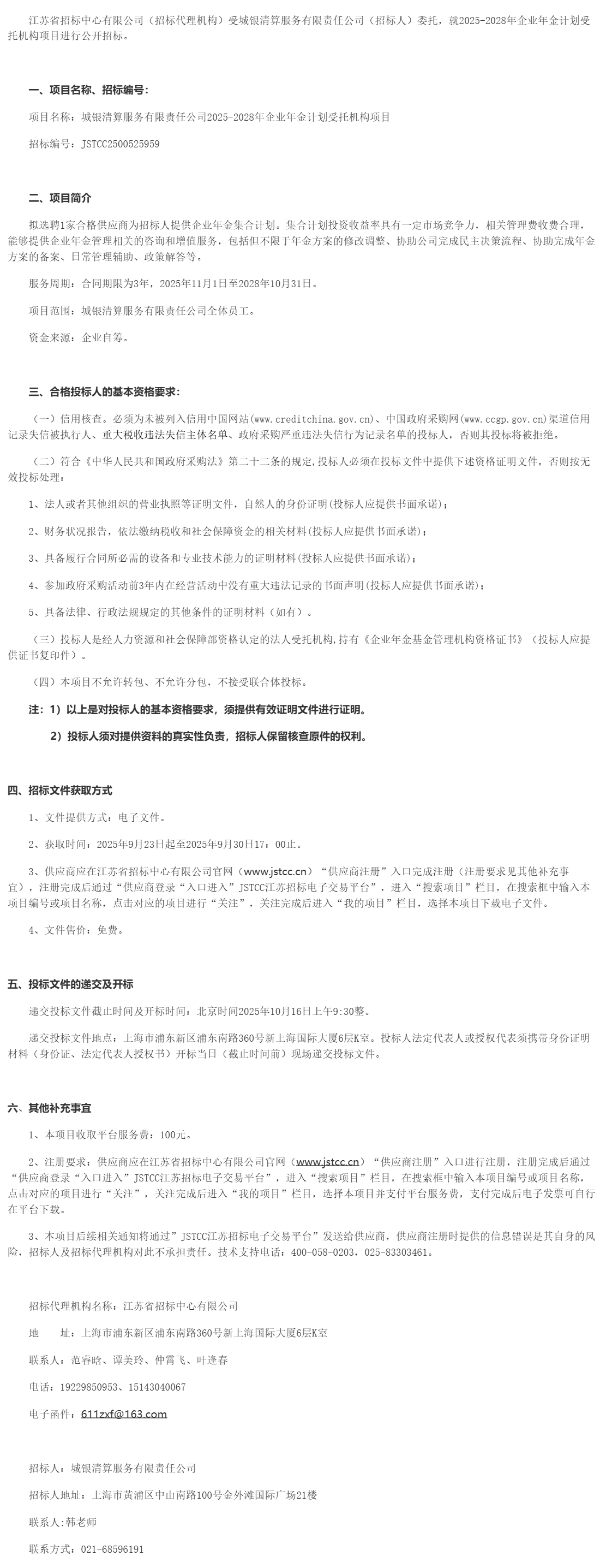 江苏省招标中心有限公司(招标代理机构)受城银清算服务有限责任公司(招标人)委托,就*********年企业年金计划受托机构项目进行公开招标。