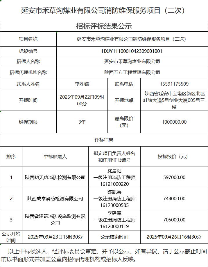 延安市禾草沟煤业有限公司消防维保服务项目(二次)中标候选人公示