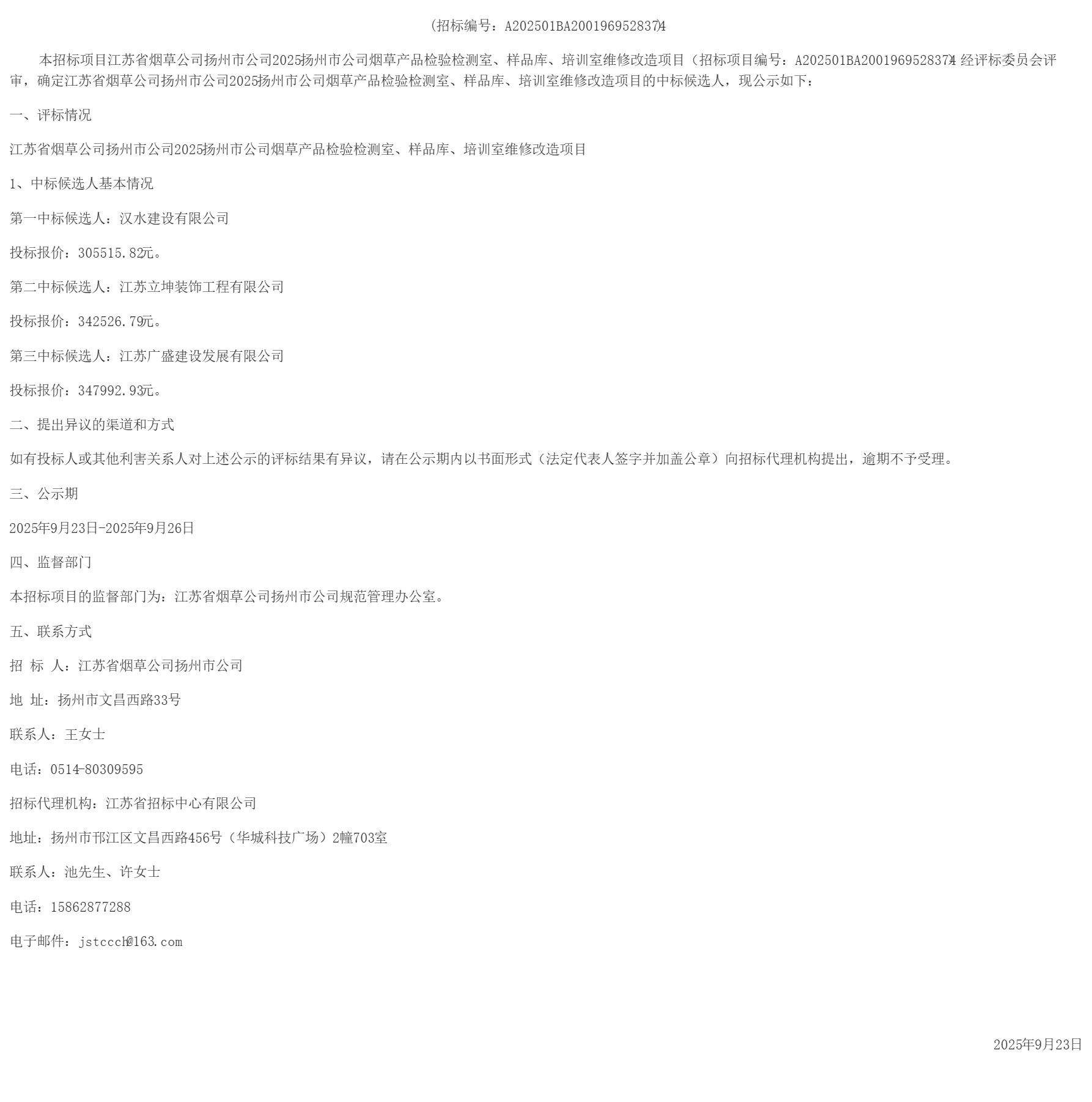江苏省烟草公司扬州市公司2025扬州市公司烟草产品检验检测室、样品库、培训室维修改造项目-中标候选人公示