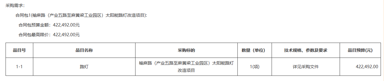 | *** | 路灯 | 榆麻路(产业五路至麻黄梁工业园区)太阳能路灯改造项目 | *(项) | 详见采购文件 | ***,***.** |
