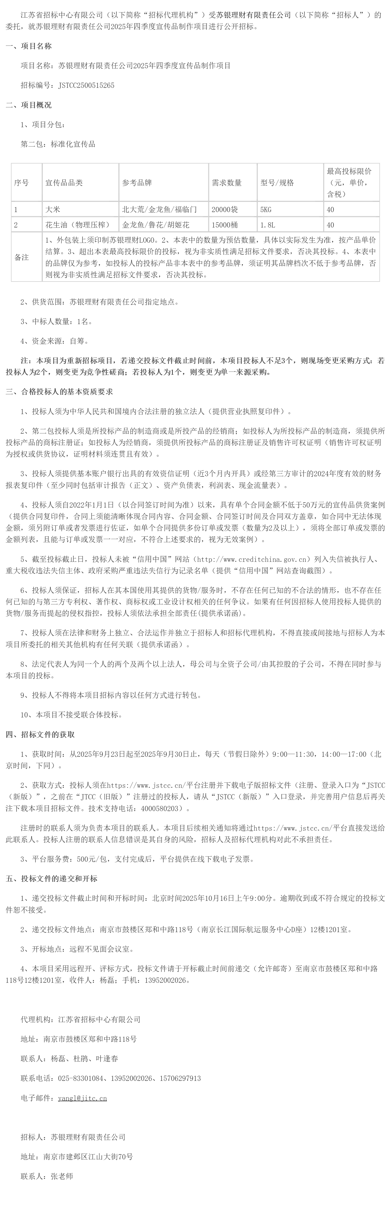 江苏省招标中心有限公司(以下简称“招标代理机构”)受苏银理财有限责任公司(以下简称“招标人”)的委托,就苏银理财有限责任公司****年四季度宣传品制作项目进行公开招标。