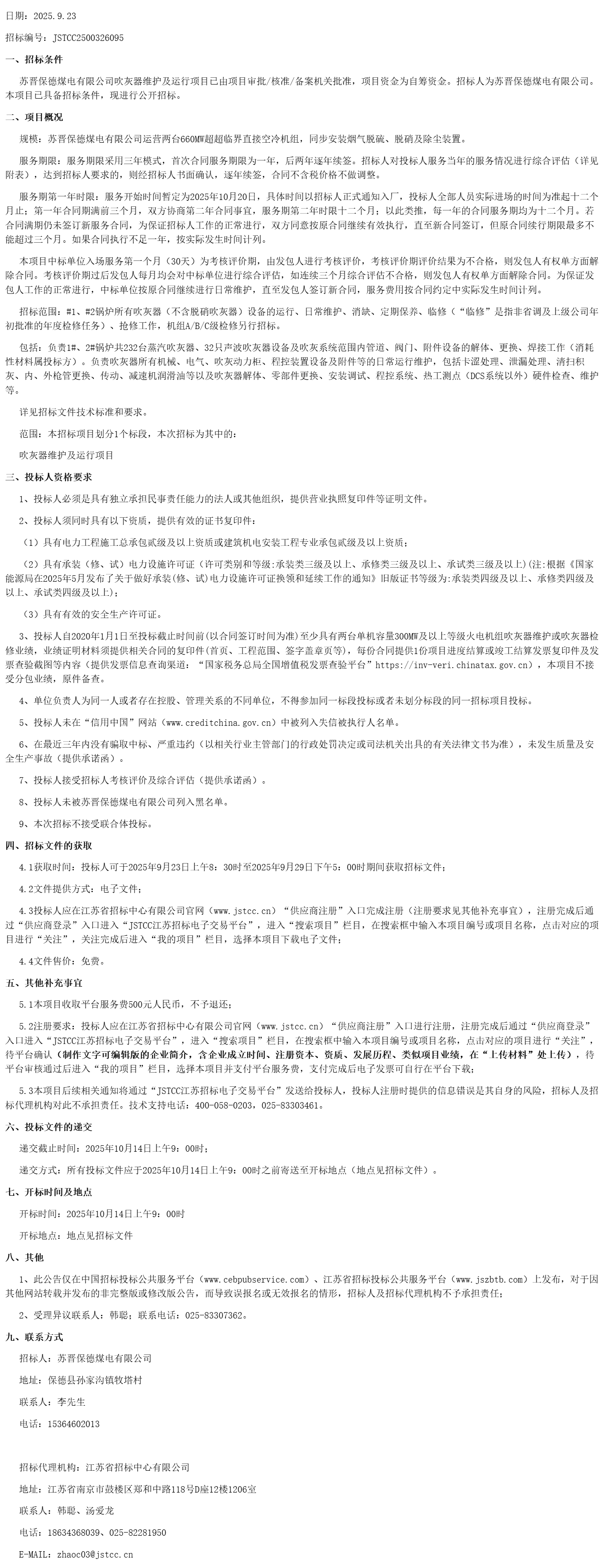 苏晋保德煤电有限公司吹灰器维护及运行项目招标公告(***************)