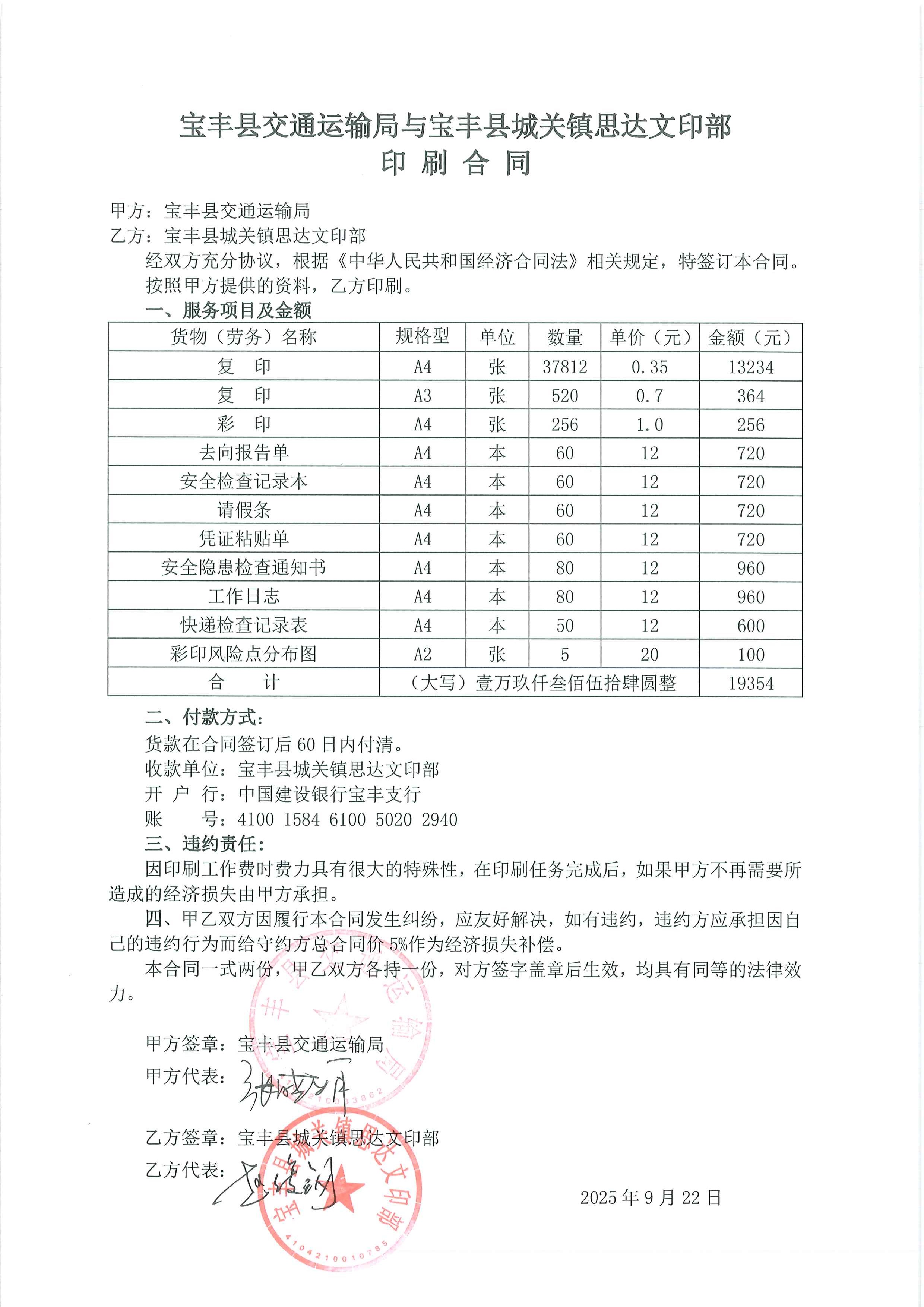 | 二、合同名称:宝丰县交通运输局道路运输服务中心印刷服务费 | ||||||||||||