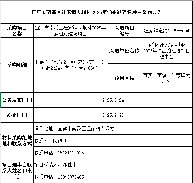 宜宾市南溪区汪家镇大坝村2025年通组路建设项目采购公告