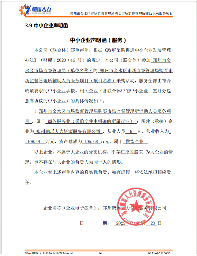郑州市金水区市场监督管理局购买市场监督管理所辅助人员服务项目*中标公告
