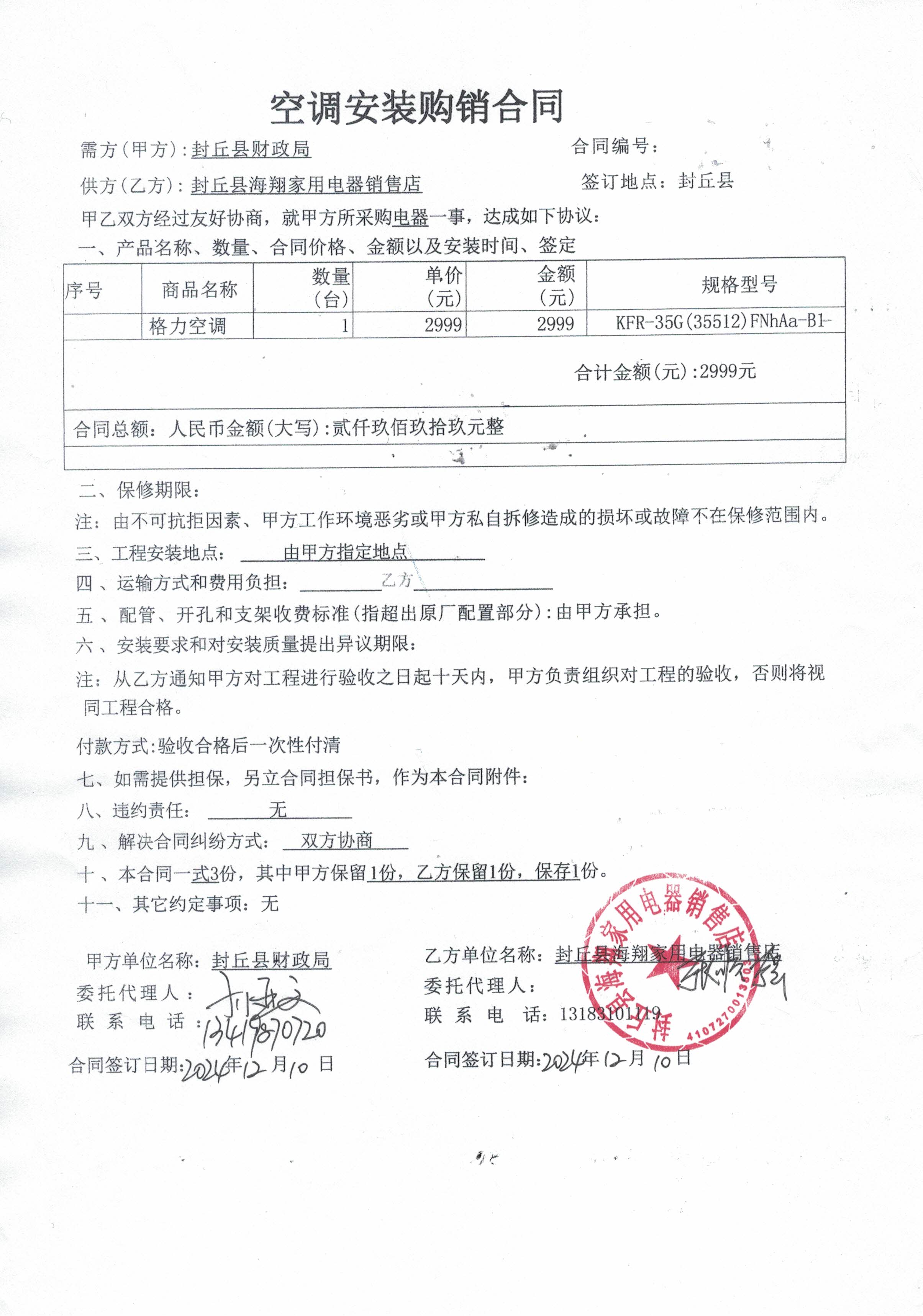 | *.供应商(乙方):封丘县海翔家用电器销售店 | ||||||||||||