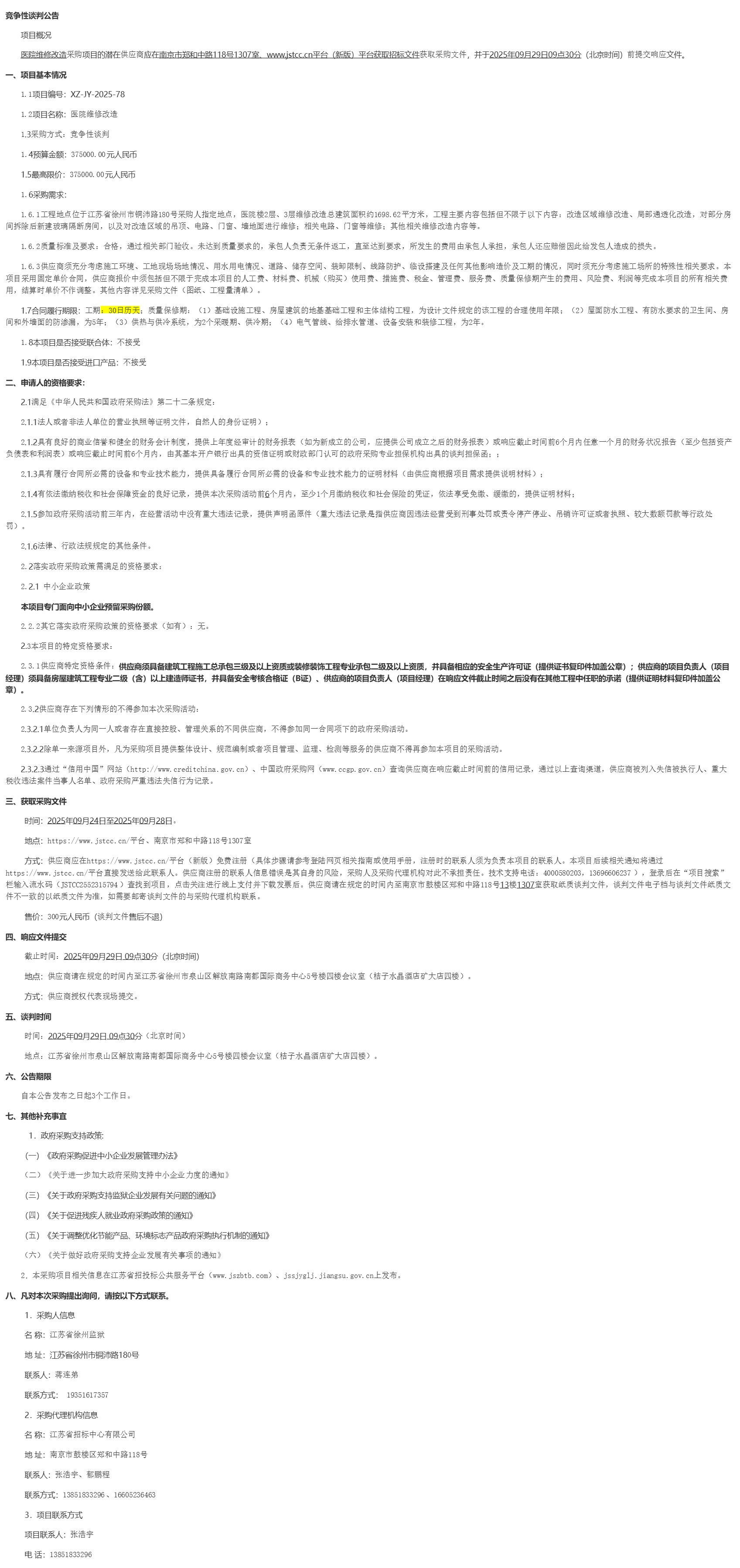 *.*.*工程地点位于江苏省徐州市铜沛路***号采购人指定地点,医院楼*层、*层维修改造总建筑面积约****.**平方米,工程主要内容包括但不限于以下内容:改造区域维修改造、局部通透化改造,对部分房间拆除后新建玻璃隔断房间,以及对改造区域的吊顶、电路、门窗、墙地面进行维修;相关电路、门窗等维修;其他相关维修改造内容等。
