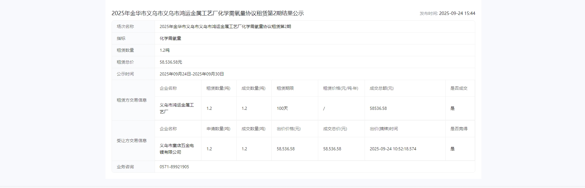 华市义乌市义乌市鸿运金属工艺厂化学需氧量协议租赁第*期结果公示
