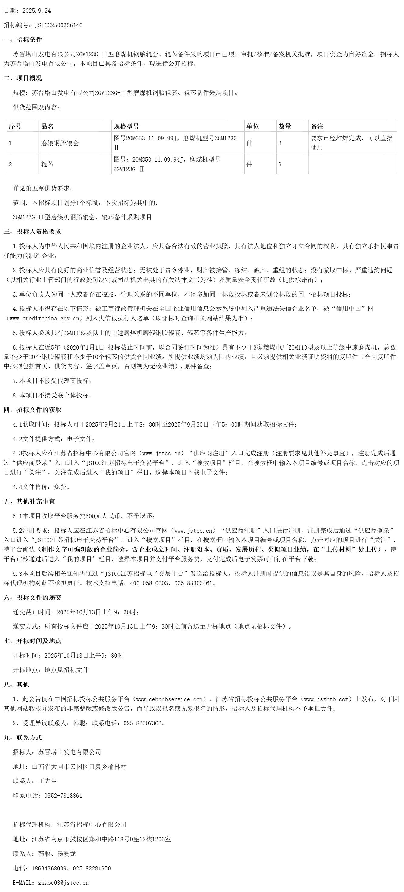 苏晋塔山发电有限公司**********型磨煤机钢胎辊套、辊芯备件采购项目招标公告(***************)