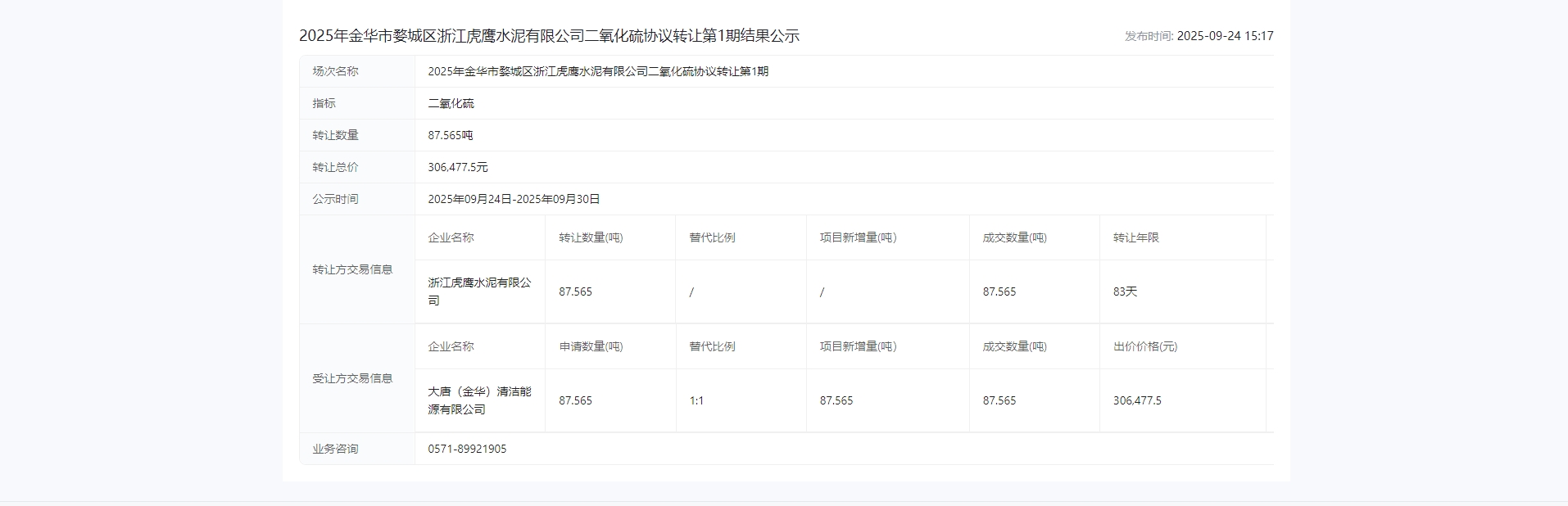 华市婺城区浙江虎鹰水泥有限公司二氧化硫协议转让第1期结果公示成交公示