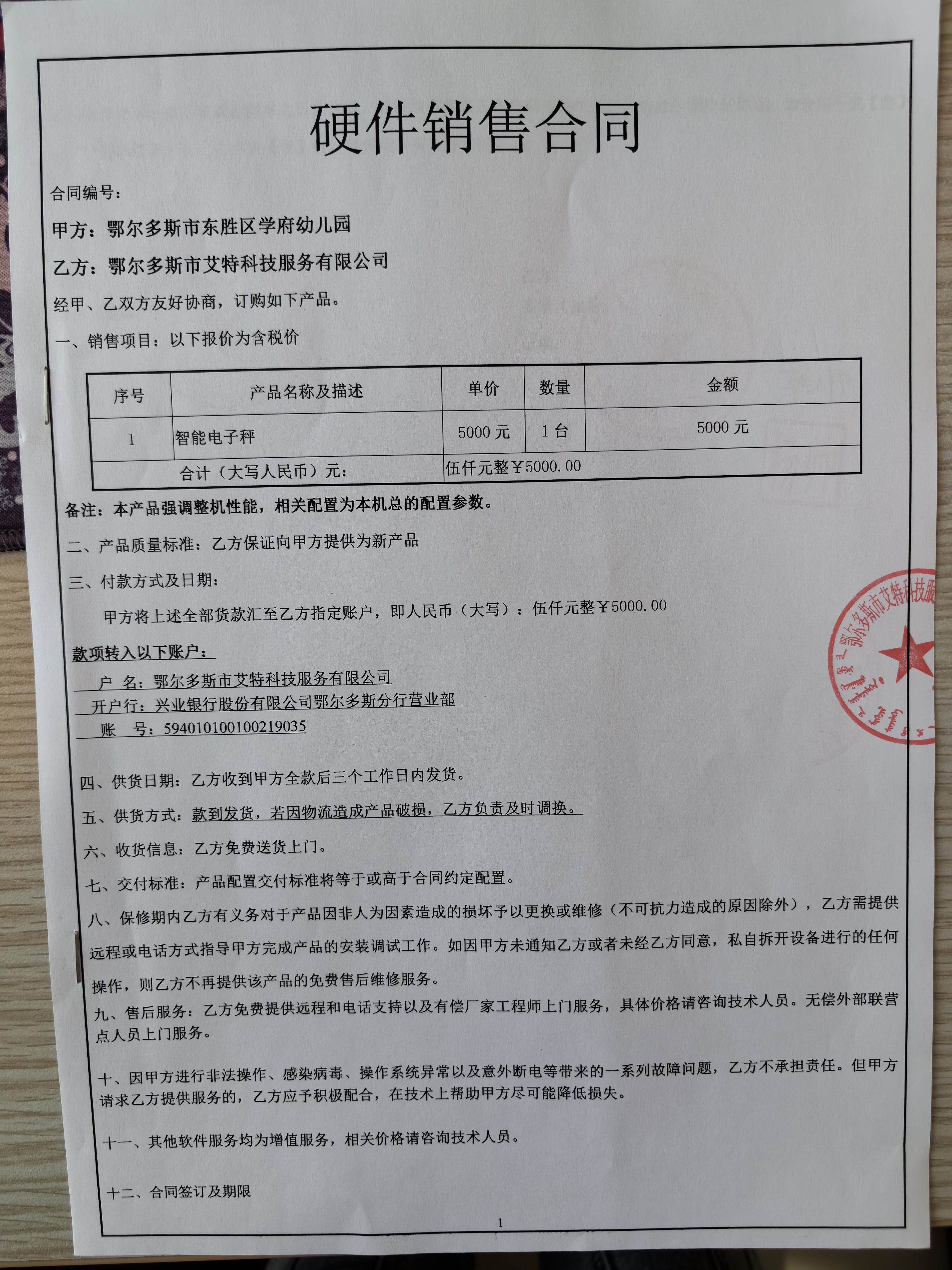 一、合同编号:*************二、合同名称:销售合同三、项目编号:鄂财购备字(电子)[****]*******号四、项目名称:厨房系统应用软件五、合同主体采购人(甲方):鄂尔多斯市东胜区学府幼儿园 地址:鄂尔多斯市东胜区 联系方式:*********** 供应商(乙方):鄂尔多斯市艾特科技服务有限公司 地址:内蒙古自治区鄂尔多斯市东胜区天骄街道 联系方式:*********** 六、合同主要信息主要标的: