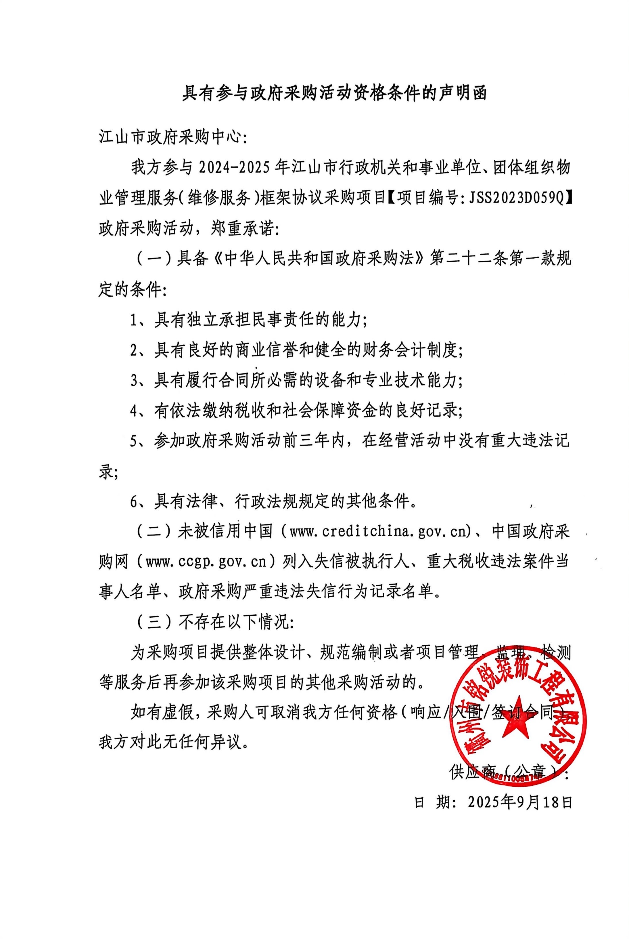 完全响应征集文件要求:具有参与政府采购活动资格条件的声明函.***