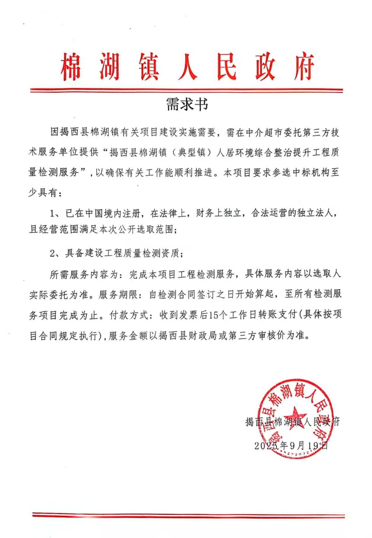 关于为【揭西县棉湖镇(典型镇)人居环境综合整治提升工程质量检测服务】公开选取【建设工程质量检测】机构的公告
