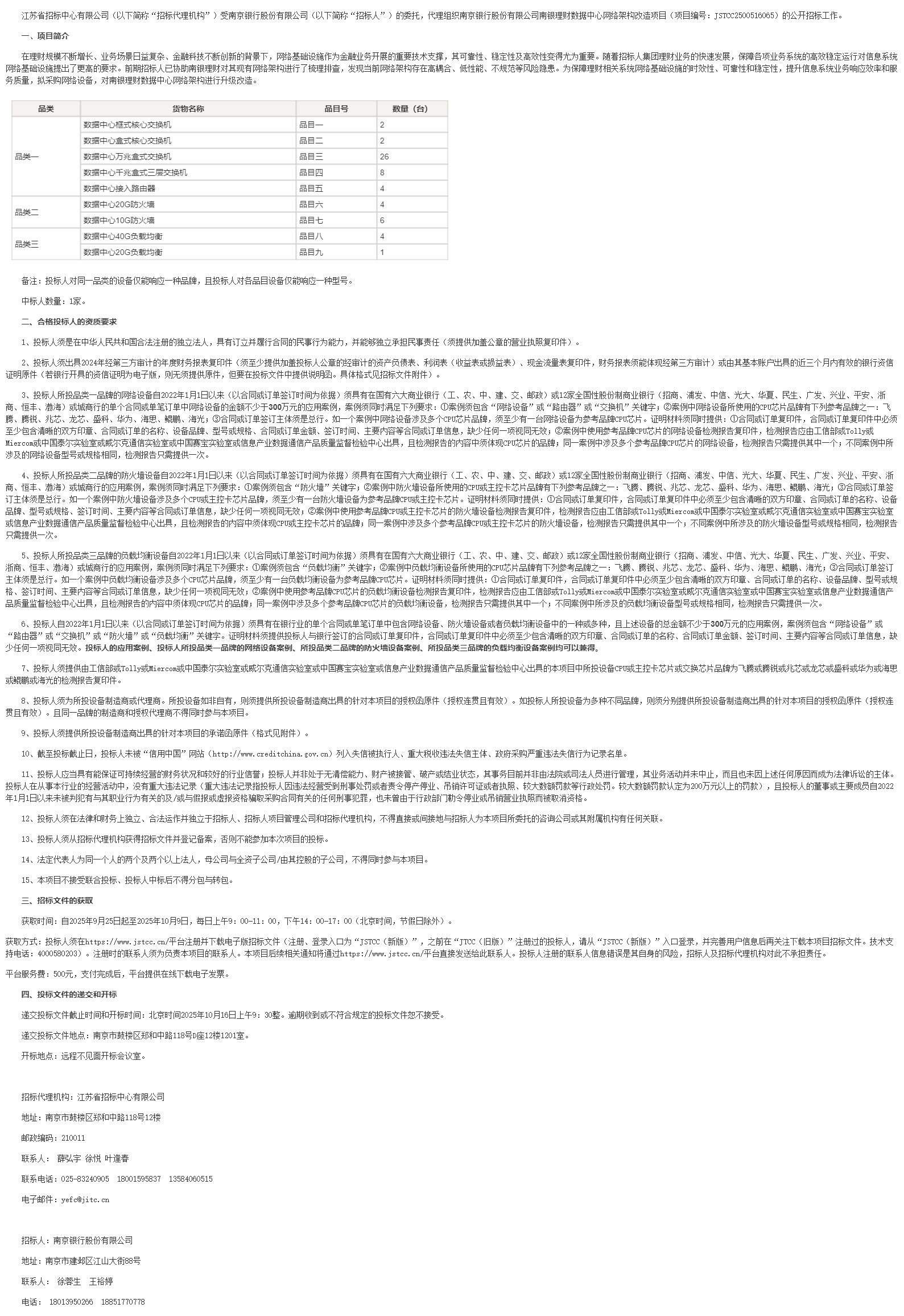江苏省招标中心有限公司(以下简称“招标代理机构”)受南京银行股份有限公司(以下简称“招标人”)的委托,代理组织南京银行股份有限公司南银理财数据中心网络架构改造项目(项目编号:***************)的公开招标工作。