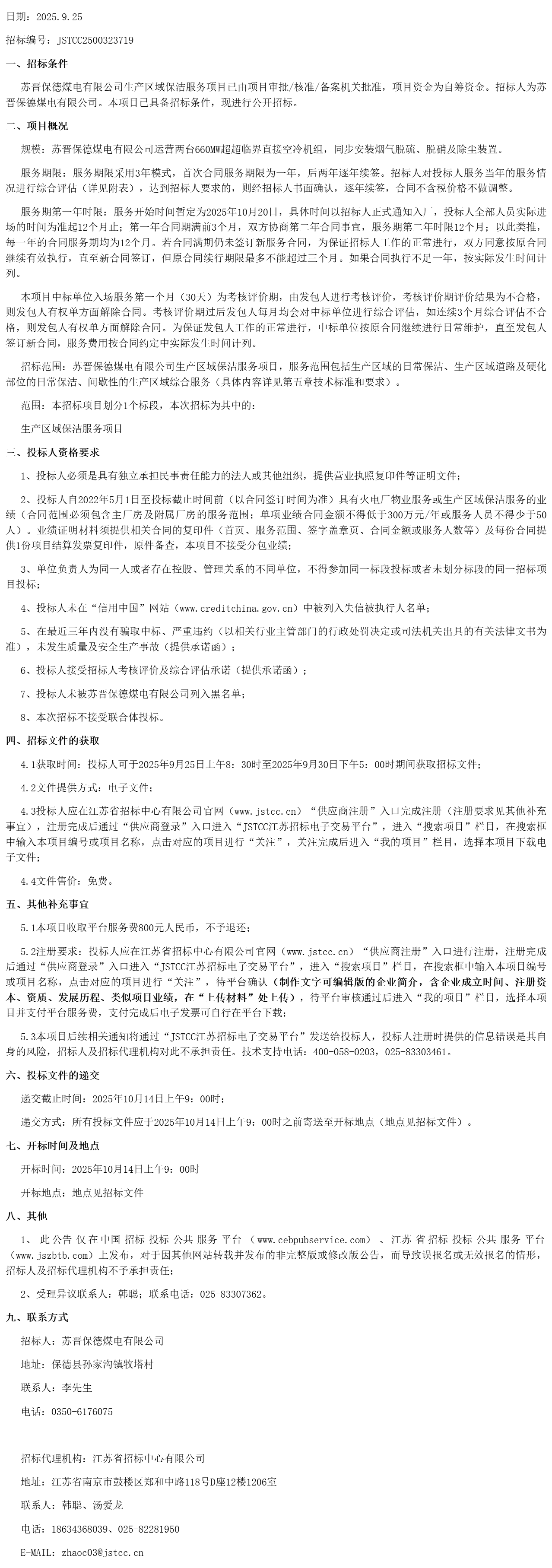苏晋保德煤电有限公司生产区域保洁服务项目(第二次重新招标)招标公告(***************)