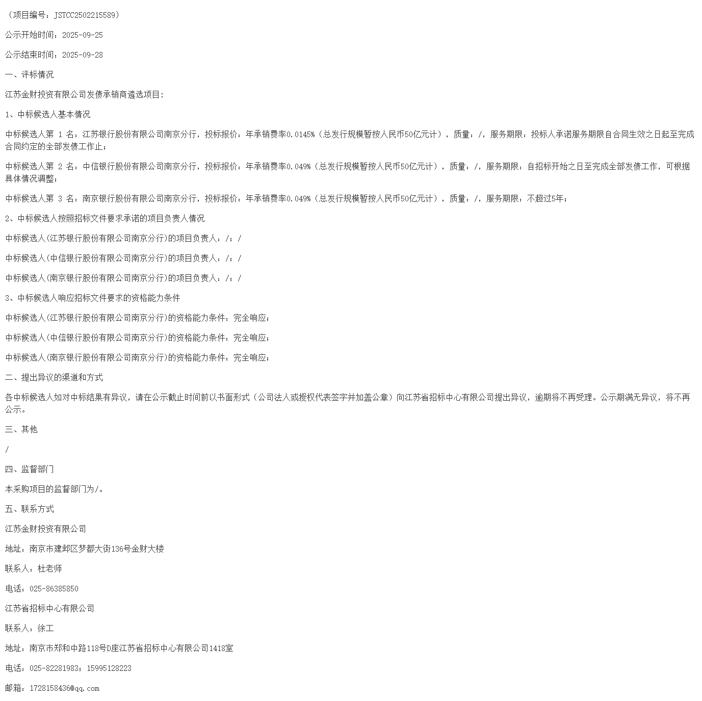 中标候选人第 * 名:江苏银行股份有限公司南京分行,投标报价:年承销费率*.****%(总发行规模暂按人民币**亿元计),质量:/,服务期限:投标人承诺服务期限自合同生效之日起至完成合同约定的全部发债工作止;
