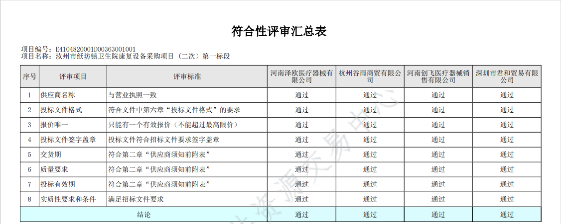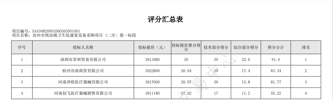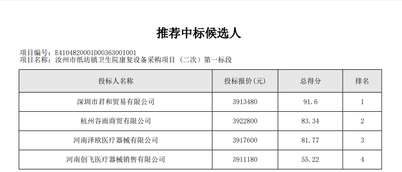| *.开标记录【详见附件*】*.资格审查表【详见附件*】*.符合性审查表【详见附件*】*.评标委员会对所有供应商投标文件的总分排序 【详见附件*】*.各评委成员对所有供应商投标文件的分项评分明细【详见附件*】*.供应商投标文件被否决原因【无,详见附件*】*.被推荐供应商名单及理由【详见附件*】*.供应商所投报类似业绩【详见附件*】*.根据评审结果、中标结果公告,按照国家有关规定,确定深圳市君和贸易有限公司为中标供应商,其他供应商未中标。**.受理投诉监督管理部门:汝州市财政局 联系电话:************ 邮箱地址:********@***.*** 联系地址:汝州市望嵩中路***号**.各有关当事人对中标结果如有异议的,可以在中标结果公告期限结束后七个工作日内,按照《政府采购质疑和投诉办法》相关规定,由法定代表人或其授权代表人携带本人身份证件(原件和加盖公章的复印件)、质疑函原件(加盖公章及法定代表人或其授权代表签字)及相关证明材料向采购人和采购代理机构以书面形式提出质疑,逾期将不再受理。 | |||||||||||||||||||||||||||||||