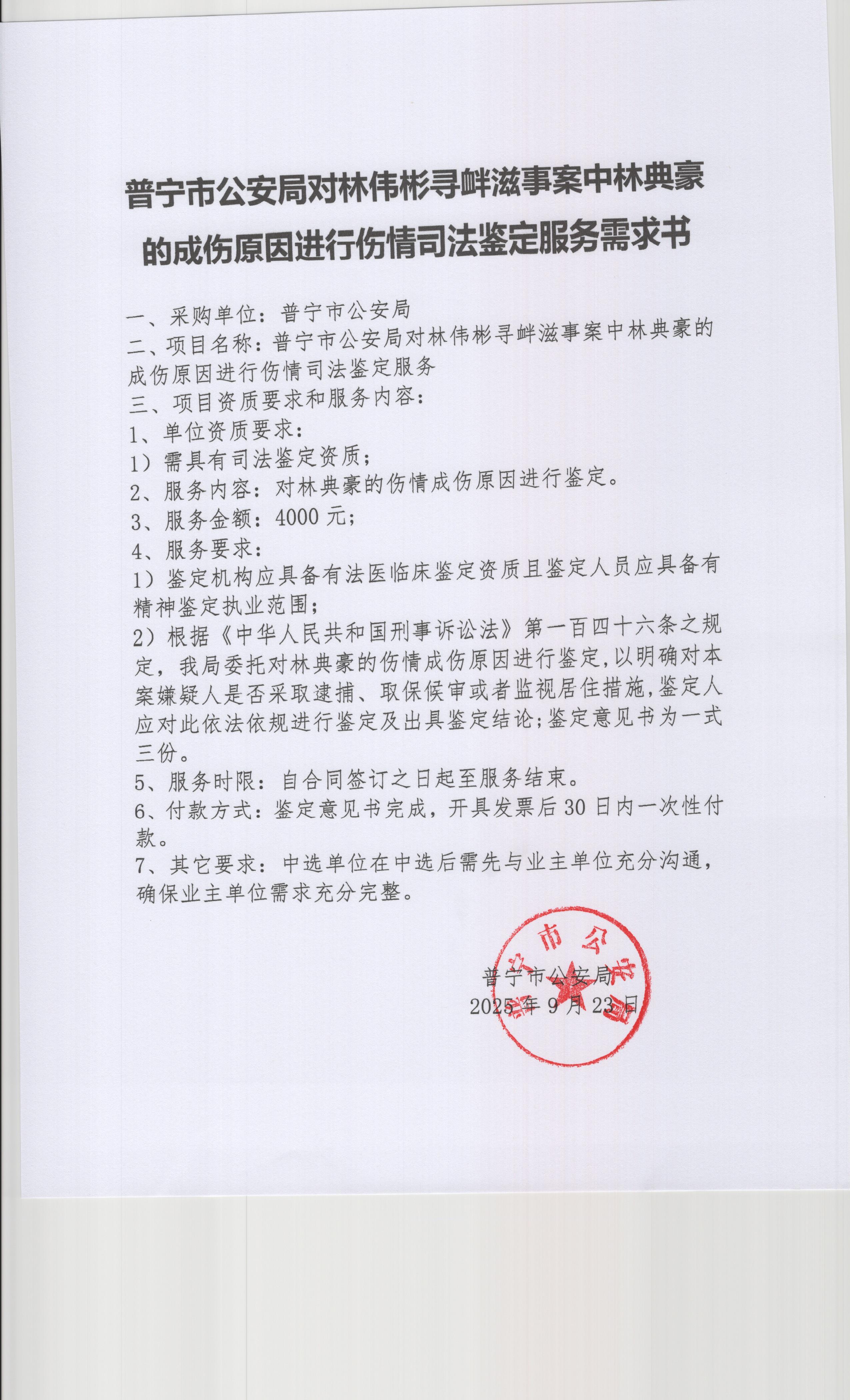 普宁市公安局对林伟彬寻衅滋事案中林典豪的成伤原因进行伤情司法鉴定服务采购公告