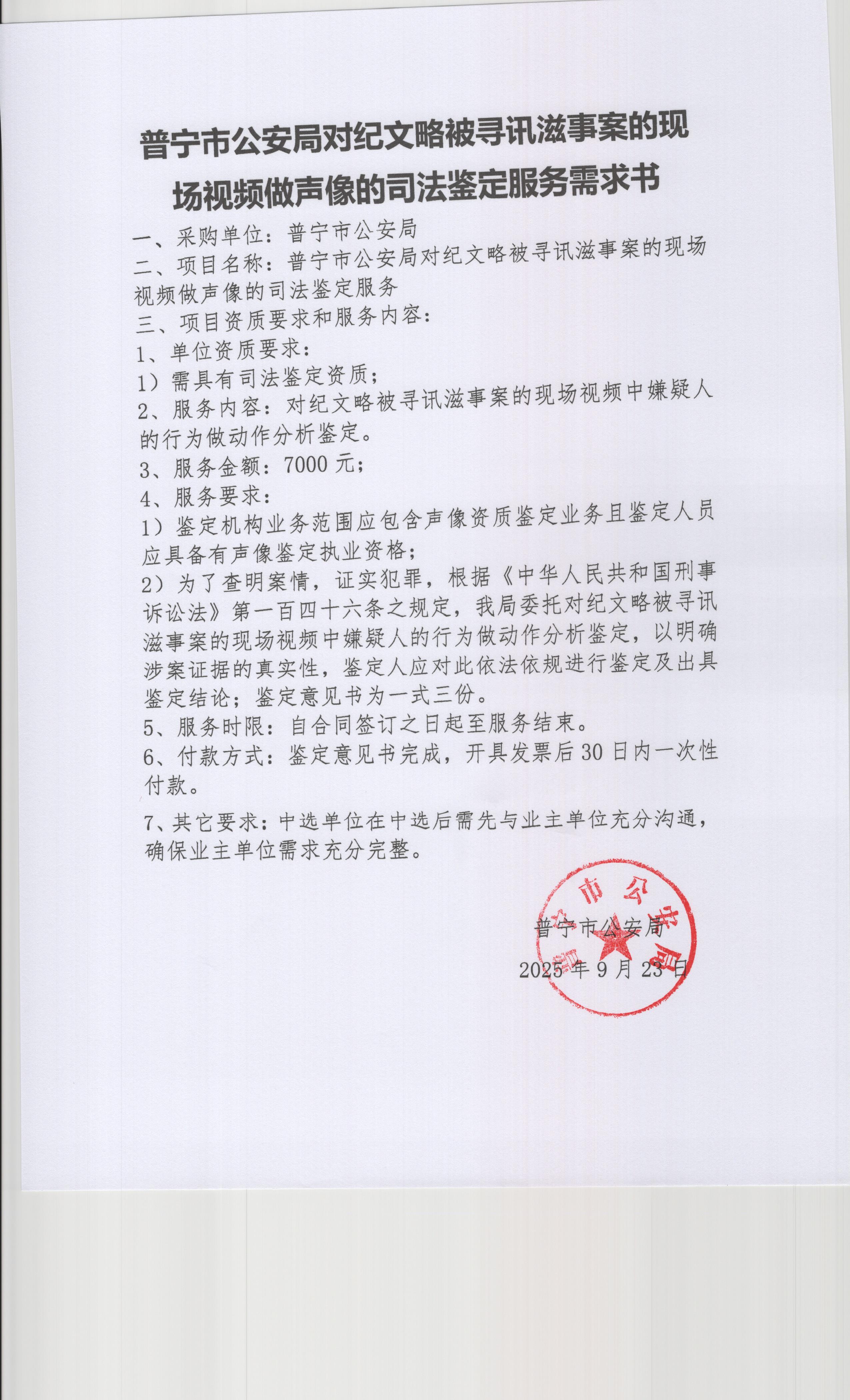 普宁市公安局对纪文略被寻讯滋事案的现场视频做声像的司法鉴定服务采购公告