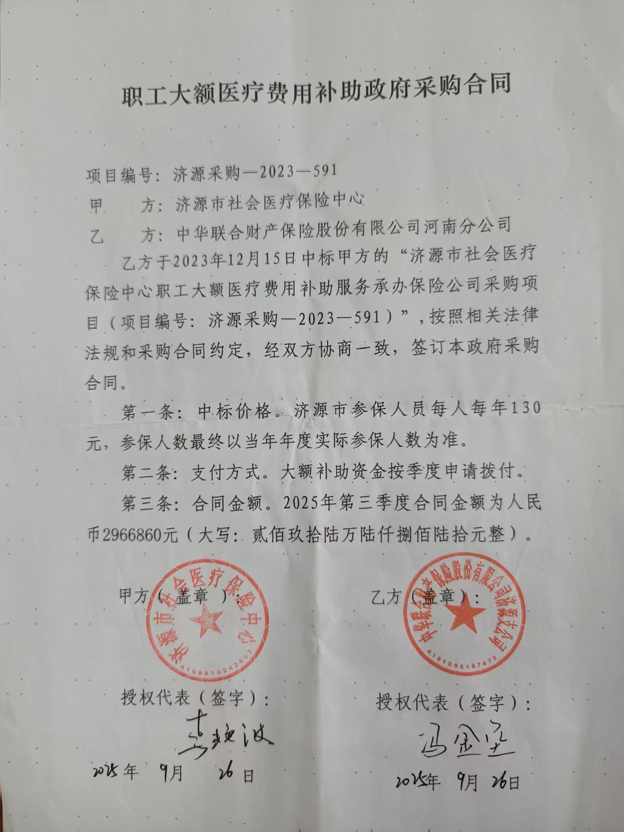 | 二、合同名称:济源市社会医疗保险中心职工大额医疗费用补助服务承办保险公司采购项目 | ||||||||||||