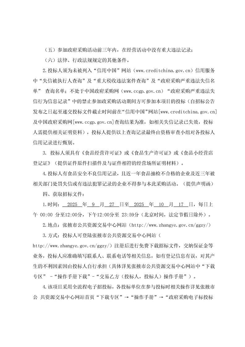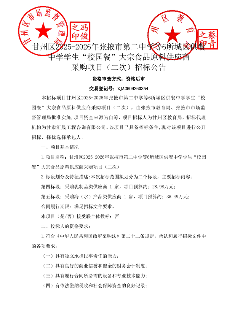 甘州区2025-2026年张掖市第二中学等6所城区供餐中学学生“校园餐”大宗食品原料供应商采购项目(二次)招标公告