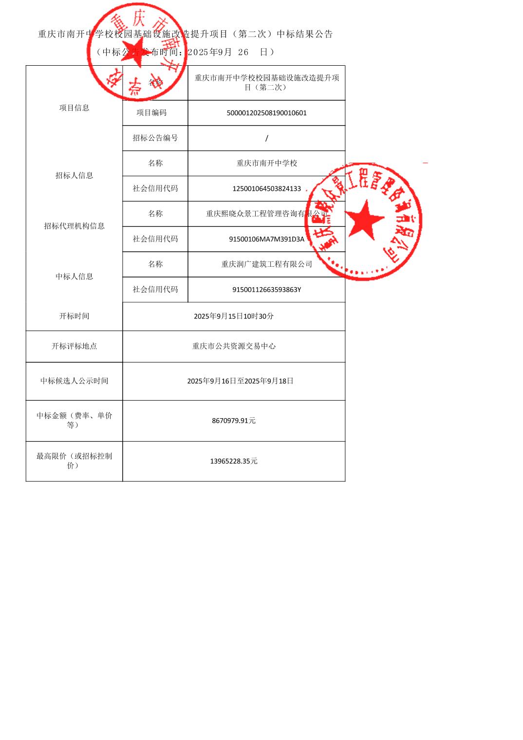 重庆市南开中学校校园基础设施改造提升项目(第二次)中标结果公告