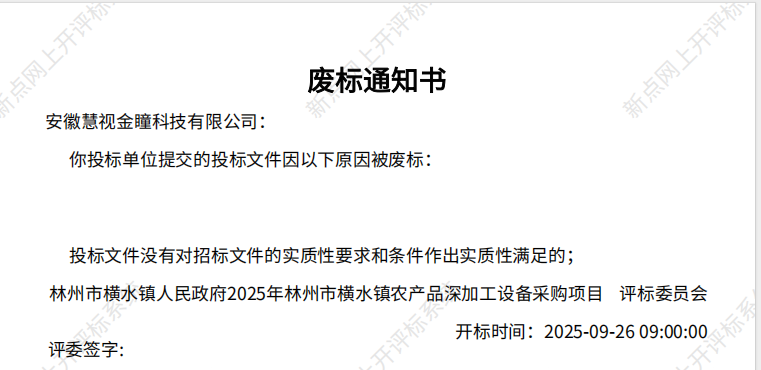 | 评标结果如下: 第一中标(成交)供应商:林州市鸿鼎商贸有限公司技术和商务:**.**分,价格:**.**分,总分:**.**分;第二中标候选供应商:林州市颂祥农业服务有限公司技术和商务:**.**分,价格:**.**分,总分:**.**分;第三中标候选供应商:林州市鹏裕商贸有限公司技术和商务:**.**分,价格:**.**分,总分:**.**分;其他供应商:林州市广声商贸有限公司总得分:**.**分;废标情况:安徽慧视金瞳科技有限公司因投标文件没有对招标文件的实质性要求和条件作出实质性满足而废标。 各有关当事人对评标结果如有异议者,可以在公告结束之日起七个工作日内,以书面形式向采购人、采购代理机构提出质疑(加盖单位公章且法定代表人签字,并附带相应的证明材料),由法定代表人或其授权代表携带企业营业执照复印件(加盖公章)及授权委托书、本人身份证件(原件)一并提交(邮寄、邮件不予受理),并以质疑函接受确认日期作为受理时间。逾期未提交或未按照要求提交的质疑函将不予受理。 | |||||||||||||||||||||||||||||||