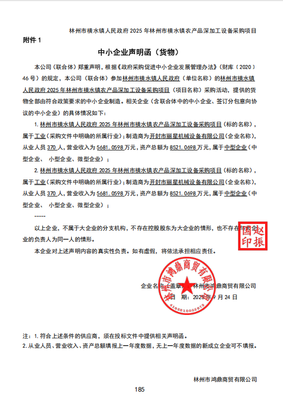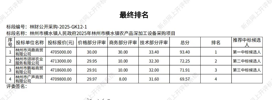 | 评标结果如下: 第一中标(成交)供应商:林州市鸿鼎商贸有限公司技术和商务:**.**分,价格:**.**分,总分:**.**分;第二中标候选供应商:林州市颂祥农业服务有限公司技术和商务:**.**分,价格:**.**分,总分:**.**分;第三中标候选供应商:林州市鹏裕商贸有限公司技术和商务:**.**分,价格:**.**分,总分:**.**分;其他供应商:林州市广声商贸有限公司总得分:**.**分;废标情况:安徽慧视金瞳科技有限公司因投标文件没有对招标文件的实质性要求和条件作出实质性满足而废标。 各有关当事人对评标结果如有异议者,可以在公告结束之日起七个工作日内,以书面形式向采购人、采购代理机构提出质疑(加盖单位公章且法定代表人签字,并附带相应的证明材料),由法定代表人或其授权代表携带企业营业执照复印件(加盖公章)及授权委托书、本人身份证件(原件)一并提交(邮寄、邮件不予受理),并以质疑函接受确认日期作为受理时间。逾期未提交或未按照要求提交的质疑函将不予受理。 | |||||||||||||||||||||||||||||||