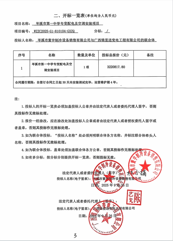广西中琪工程咨询有限公司关于岑溪市第一中学专变配电及空调安装项目中标公告