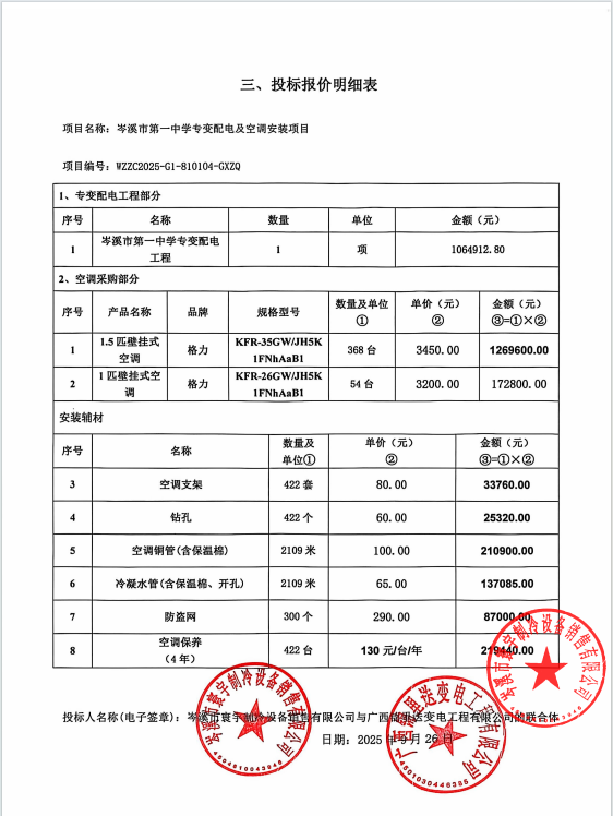二、项目名称:岑溪市第一中学专变配电及空调安装项目