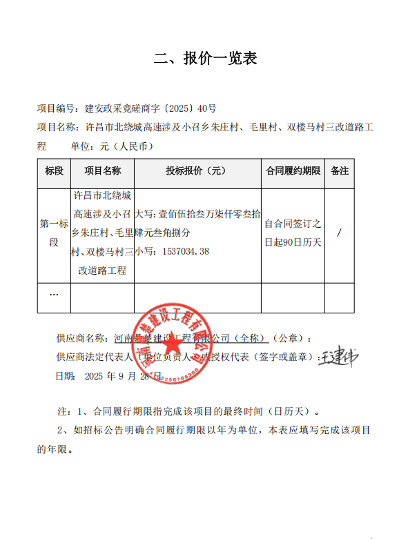 建安政采竞磋商字〔2025〕40号许昌市建安区小召乡人民政府许昌市北绕城高速涉及小召乡朱庄村、毛里村、双楼马村三改道路工程项目-成交公告